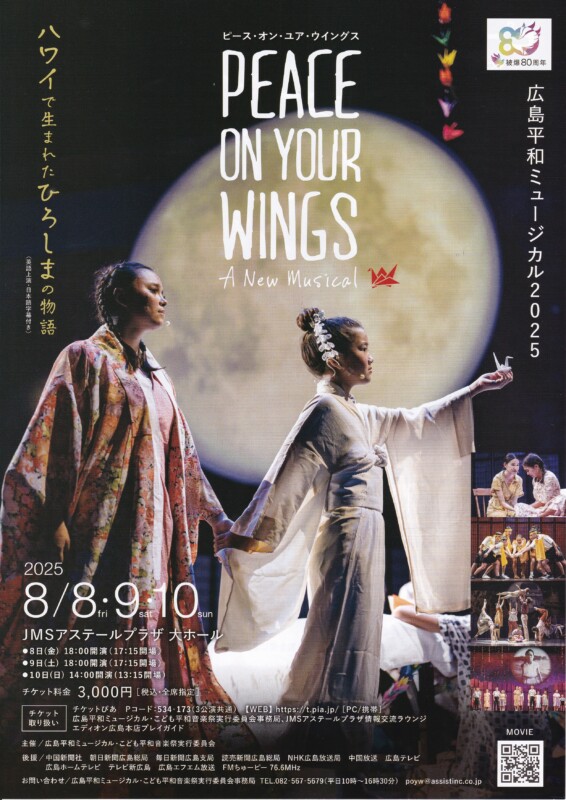 広島平和ミュージカル2025「PEACE ON YOUR WINGS」は、佐々木禎子さんの折り鶴が寄贈されたことをきっかけにオアフ島で生まれたミュージカルで、8/8~10日の3日間、JMSアステールプラザ大ホールにて開催されます。