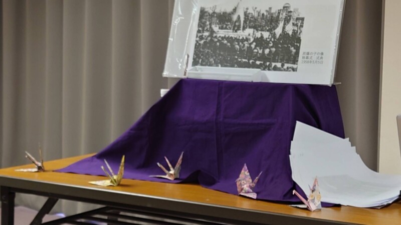 また、千羽鶴を折って原爆の子の像に奉納して来たことも教えてくださり写真を見せていただきました。2000羽以上をつながれた作業に本当に頭が下がる思いと共に、皆さんのあたたかいお気持ちに感動いたしました。