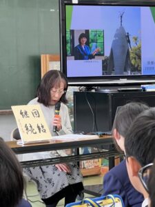 私は、小学生に聞いてもらうのは初めてでした。最初は少し心配でしたが、多くの子供達がメモを取ってくれている姿を目にし、安心してお話ができました。佐々木禎子さんと同じ年頃の子供達が聴いてくれていると思うと、緊張すると共にしっかり伝えねばという気持ちになりました。また、禎ちゃんはこんなに幼かったんだなと思うと、灌漑深い気持ちにもなり、もっと多くの子供達に伝えたいと思いました。