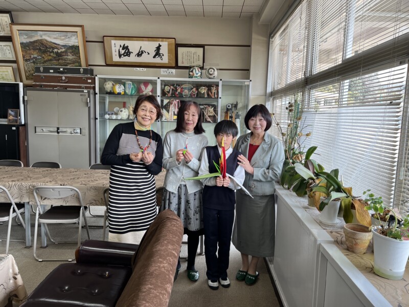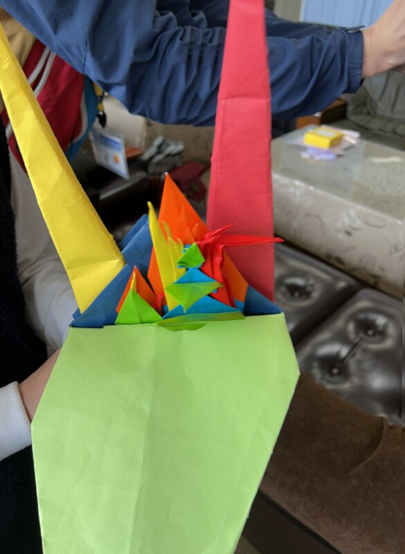 講話終了後、小さい頃から折り鶴を折り続けているという5年生の生徒さんが、その折り鶴を持って見せに来てくださいました。